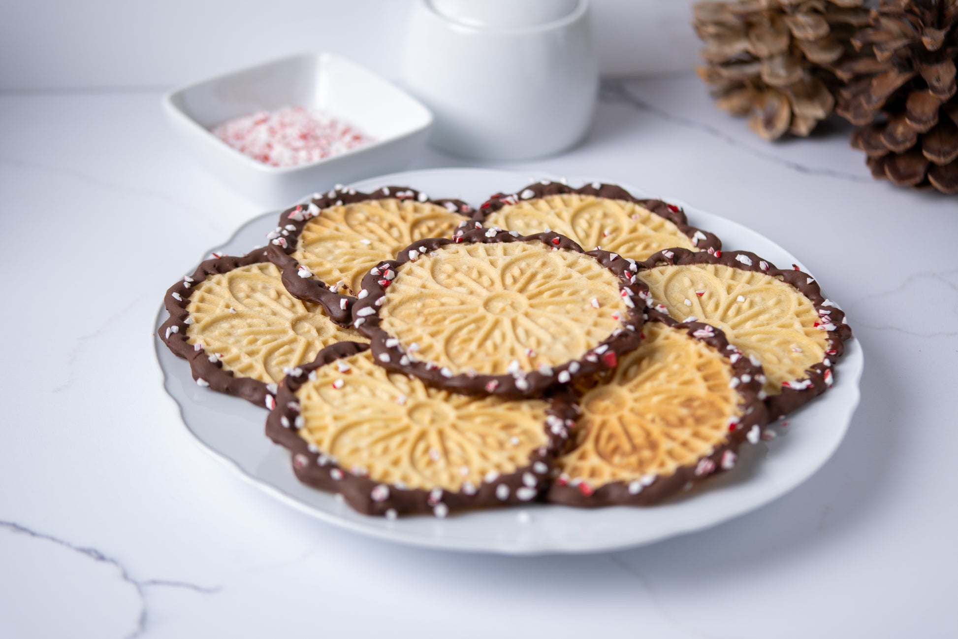 Crisp, cool, and delightfully festive - our Peppermint Pizzelle is infused with refreshing peppermint, dipped in smooth chocolate, and finished with crushed peppermint for a true holiday crunch. A seasonal limited edition flavor available only for the holidays. Sold by the dozen.